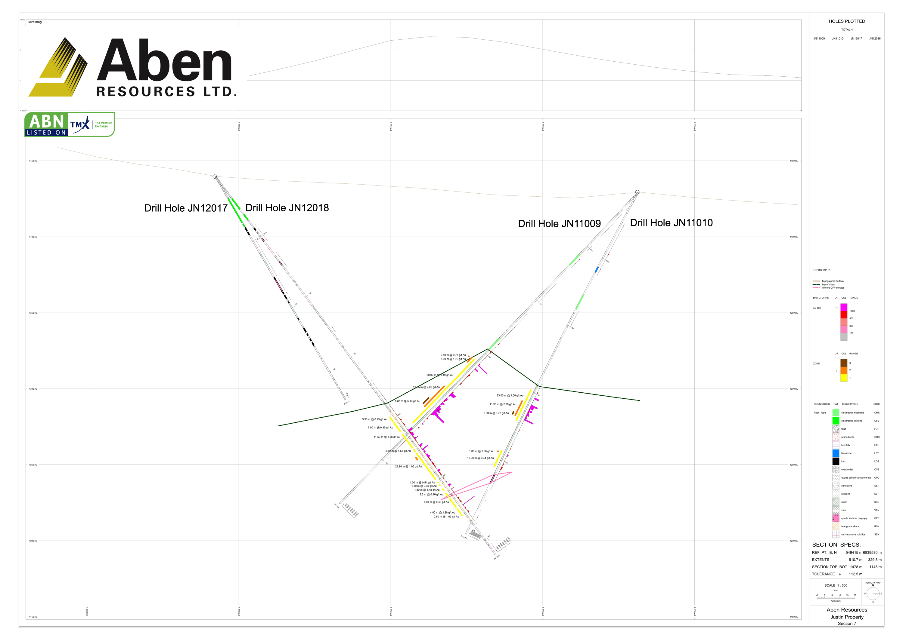 Tim J. Termuende, P.Geo., is a Director and the Qualified Person for Aben Resources’ Justin Project as defined by National Instrument 43-101, has reviewed and approved the technical information in this release. Rock and drill core analysis was conducted by ALS Minerals Canada. Samples were analyzed for multiple elements by aqua regia 35 element ICP-AES and for gold by 30 gram fire assay with AA finish. Gravimetric fire assay was done for samples returning greater than 10 g/t Au from ICP-AES analysis. When visible gold was noted in drill core or rock samples, and where fire assay results returned grades > 5.0 g/t Au, “Metallic Screen Fire Assay” analysis was utilized. Screen metallic assay results are accepted as the most representative value and are used in the geochemical database. The Company has implemented a quality assurance and quality control (QA-QC) program to ensure that the sampling and analysis of all samples is conducted in accordance with industry best practices, including insertions of blank, standard, and duplicate samples.
