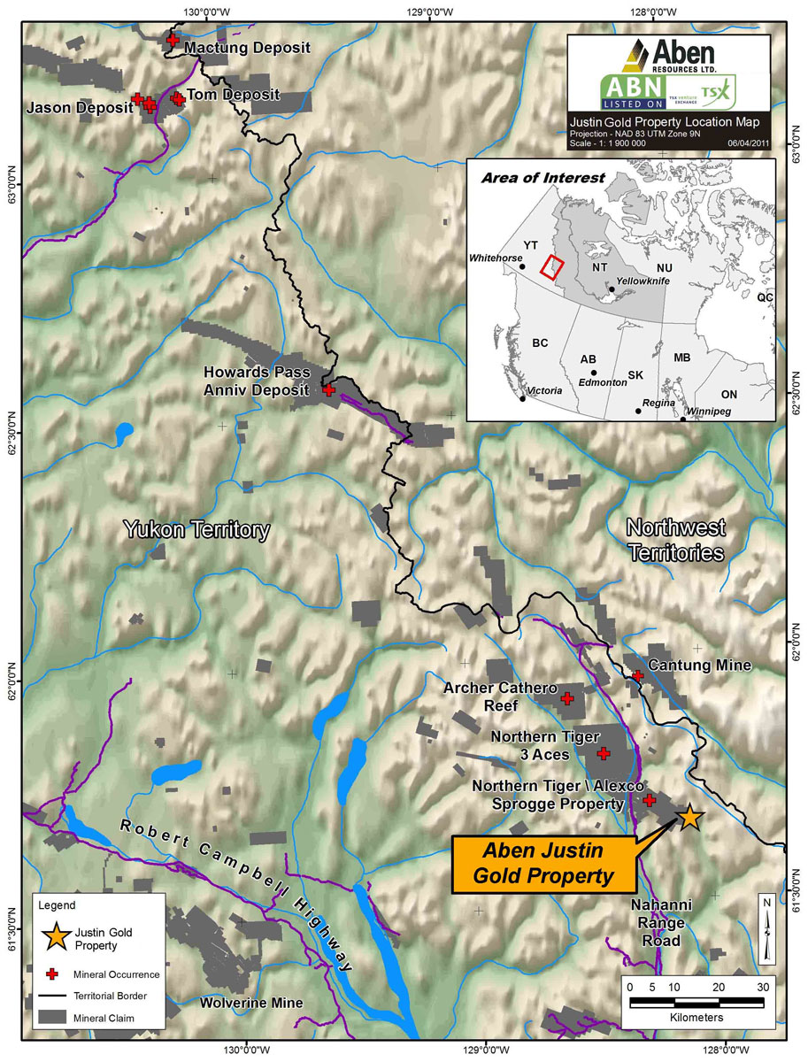 Aben Resources is a Canadian gold and silver exploration company exploring and developing its portfolio of properties in the Yukon and NWT in which it has exploration rights to more than 600,000 acres of land. The Company’s road-accessible flagship property, the Justin Gold Project, boasts a new greenfield discovery made in 2011. An aggressive 2012 follow-up surface exploration and diamond drilling program is currently underway.